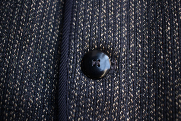 随所に使用されているヘリンボーン織のパイピングテープは、ゆくゆくは生地の色が退色していくことを考慮したものとなっており、長年着用するとパイピングテープの色が抜けて風合い良くなるでしょう。