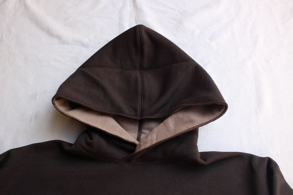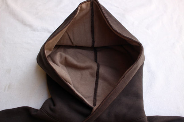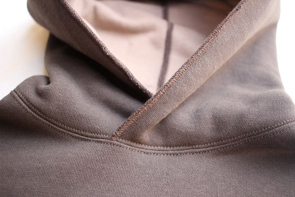 フード部分はダブルフェイスになり内側はミディアムウェイト生地を用いてロックミシンで処理される仕様です。