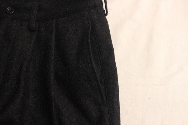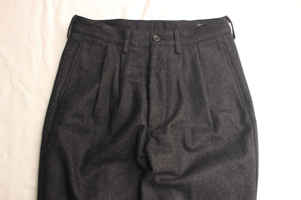 フロントにタック、ヒップ周りはゆとりがあり、裾にかけてテーパードが効いたシルエットになります。