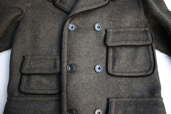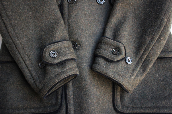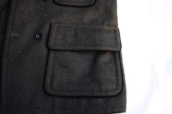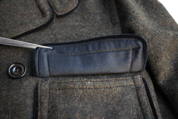 縁に挟んで縫製されたベルベットの装飾もあり、シンプルなデザインながらも印象深いコートとなっております。