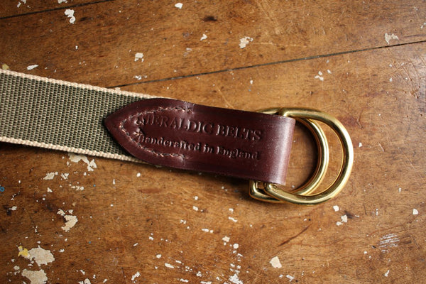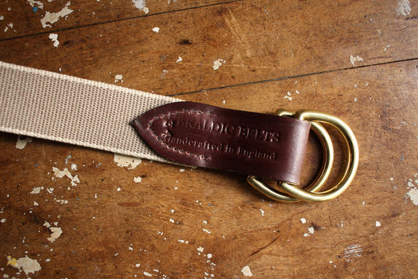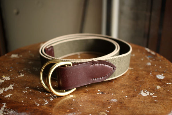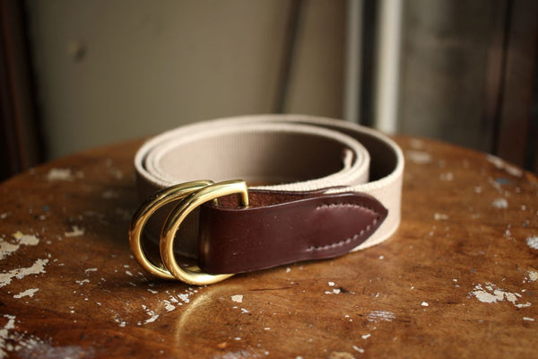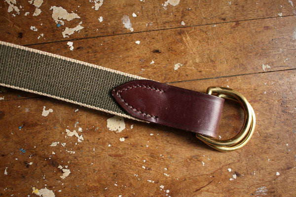 バックルは無垢のブラス製のD型リング。
